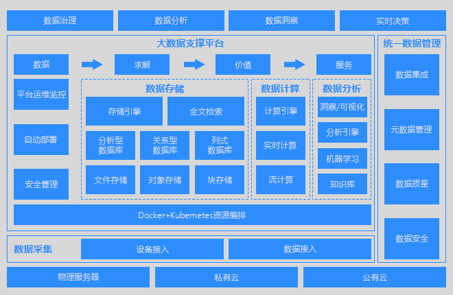 凯发k8国际首页登录科技大数据平台通过对不同的数据源按同意定义的格式进行提取,从数据导入、标准建池、交换共享、数据审计、运营监管到数据应用、决策分析、公共服务,形成完整的智慧城市大数据治理与管理体系,构建智慧城市大数据平台。从数据标准、管理、运行到决策形成完整的数据生态链,不断扩展数据边界,孕育数据应用,提升数据利用率,构建智慧城市数据生态。通过分布式存储、计算、数据治理、智能分析以及数据可视化的整套支持,帮助企业及行业解决方案提供商建立一体化的大数据平台。用户可以在大数据产品系列平台上对海量数据进行采集、清洗、治理、存储、计算、搜索、挖掘、深度学习、分析和可视化呈现,发现数据的真正价值。