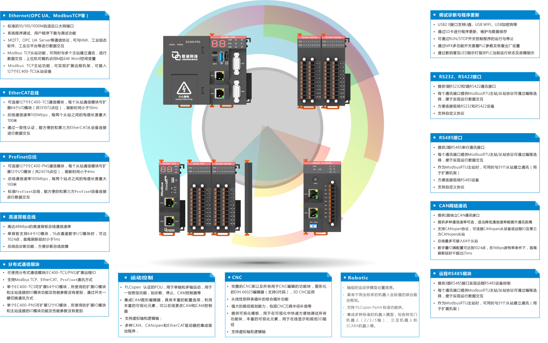 EC400系列PLC除了传统PLC的各项要求外还着重考虑了互联互通,针对工业现场,其可通过 EtherCAT、Modbus TCP、Profinet、Modbus RTU、CANopen等多种工业现场总线进行远程机架扩展以及与第三方设备互联;针对工业组态,其可通过OPCUA Ser ver、Modbus TCP、Modbus RTU、MQTT等标准通信协议以及用户自定义网络协议与各种工业组态软件进行数据交互。