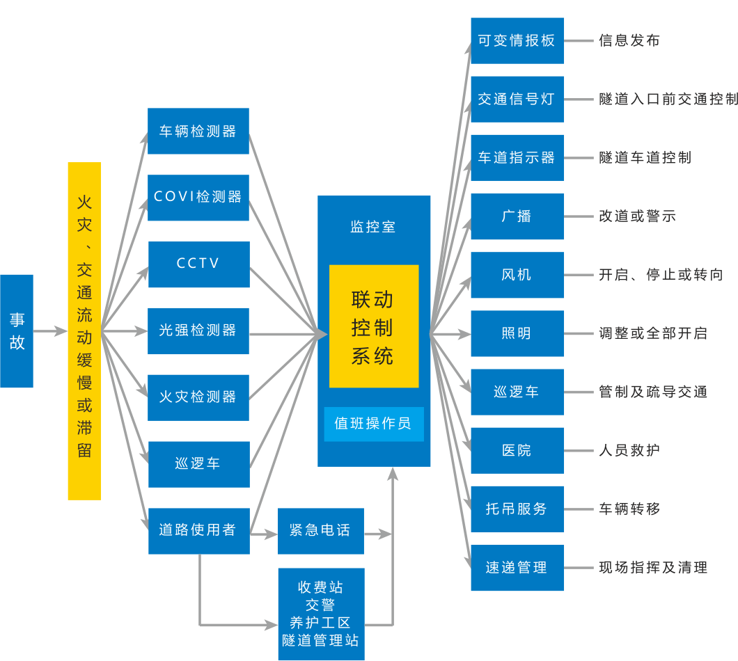 高速公路隧道消防联动及应急处置系统依据现行国家及交通行业制定实施的相关标准,按照管理部门处理突发事件目标和应急处理流程,结合隧道自身的特点, 并考虑交通流的组成、隧道所在位置的气候环境特点以及隧道在路网中的地位与位置等因素,利用现代化信息技术手段,构建一个全方位、立体化、多层次、综合性的应急管理系统框架体系,把各独立的隧道监控业务(通风、照明、交通)、视频监控、消防业务、电话及广播等各系统资源有机的整合为一体,尽可能快速准确地发现事件、定位事件,并提供一套完整的控制预案与措施,进行统一指挥,为保证及时、高效、有序、妥善处置隧道突发事件,防止事件蔓延扩大,以保障人员生命安全,减少国家财产损失,使灾害降低到最低限度,保障高速公路的安全畅通,维护良好的经营管理秩序。