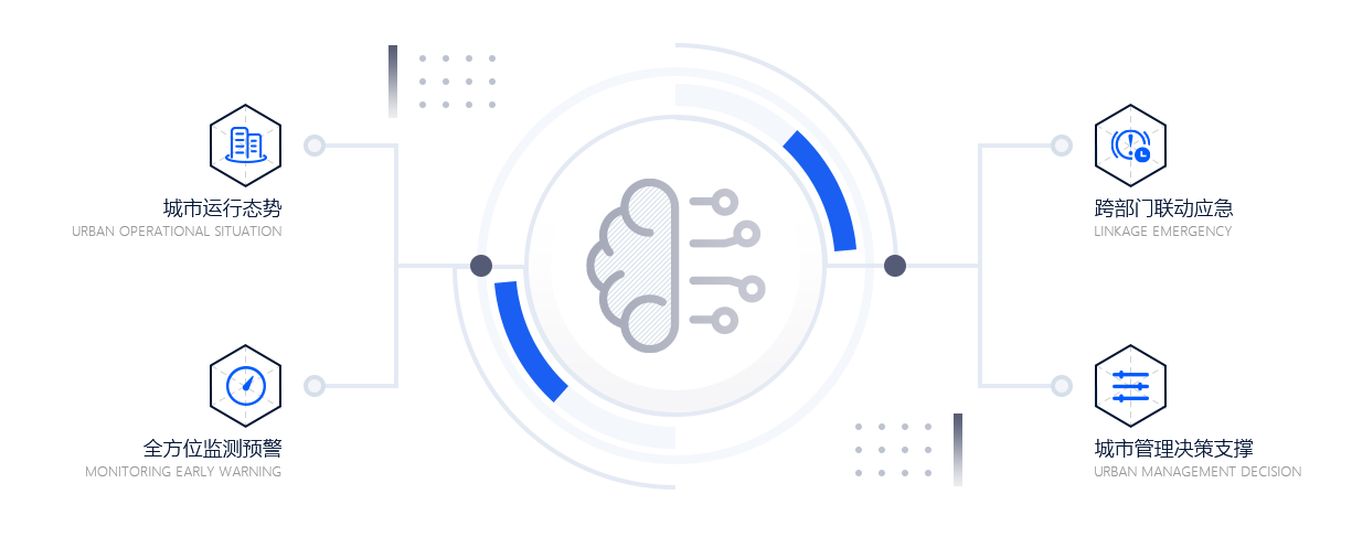 汇聚和处理来自周围神经系统的管理数据、互联网数据和物联网数据,打造万物感知、万物互联和万物智能的数字世界,它主要从四个方面为城市管理者提供高效创新的管理服务。第一城市运行态势呈现,基于GIS可视化展示经济、公共安全、交通环保民生市政设施、政务等各领域数据,便于城市管理者实时掌握城市整体运行态势,打造城市运行仪表盘。第二,全方位监测预警,基于神经感知和大数据,对城市风险隐患进行全方位实时监测和预警,确保对异常情况有效预防和及时处理,保障城市运行秩序和公共安全。第三,跨部门联动应急拉通政府各部门建设统一的应急处理流程。在诸如重大自然灾害、聚众闹事、严重环境污染等城市紧急事件突发时,通过语音、智真、视频等手段实时感知事故现场,并会商决策,对消防、交通、公安、医疗等各类资源统一调度指挥,实现跨部门协同联动,提高应急指挥和处置效率。第四,城市管理决策支撑,对经济、安全、交通、民生等城市各专项领域的海量数据进行充分关联分析和深度价值挖掘,为城市的规划、建设和管理提供决策依据,全面提升管理决策的科学性与能力。以政务大数据整合和价值创造为核心抓手推进建设,实现态势感知、运行监测、决策分析和事件管理等。