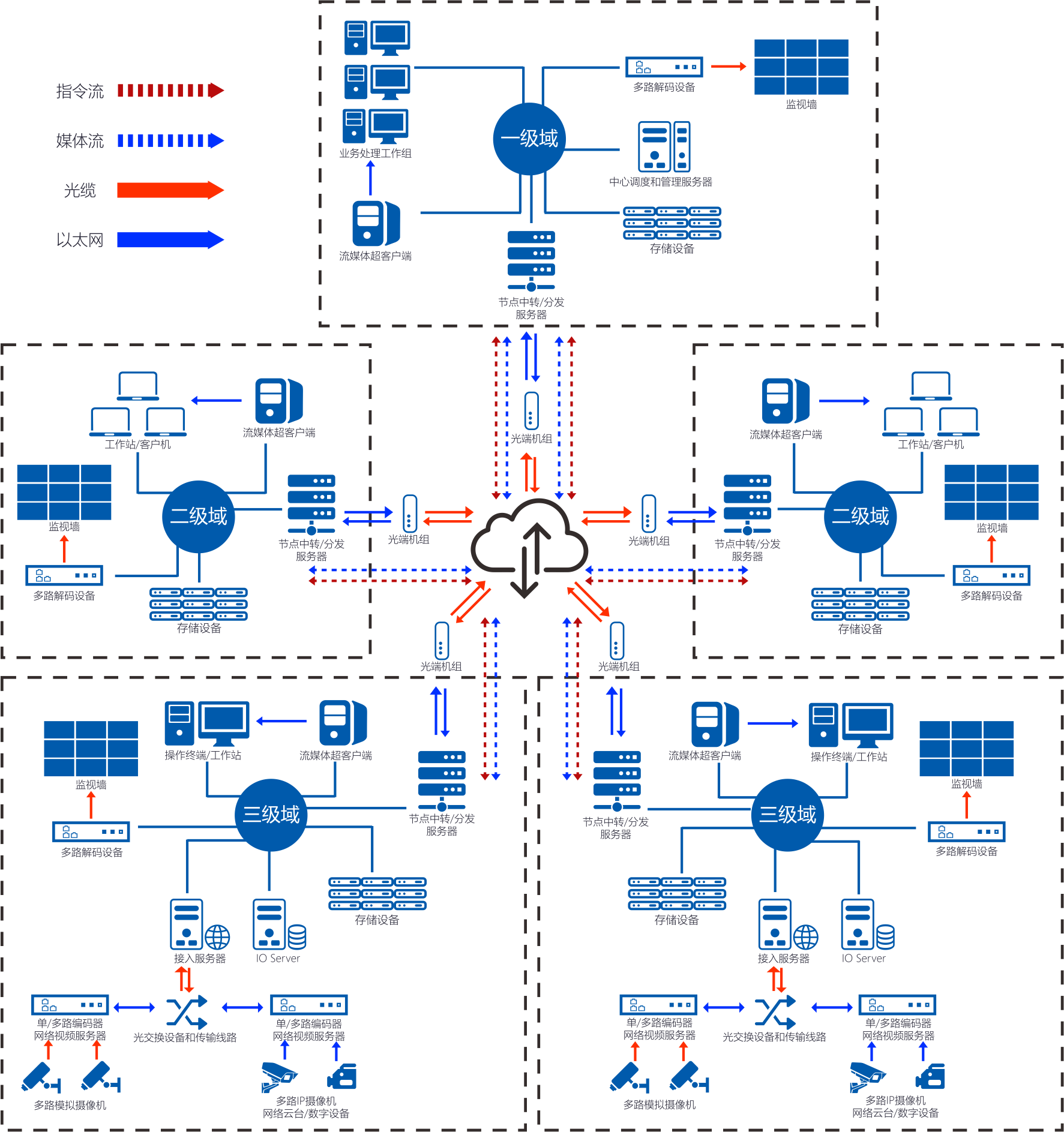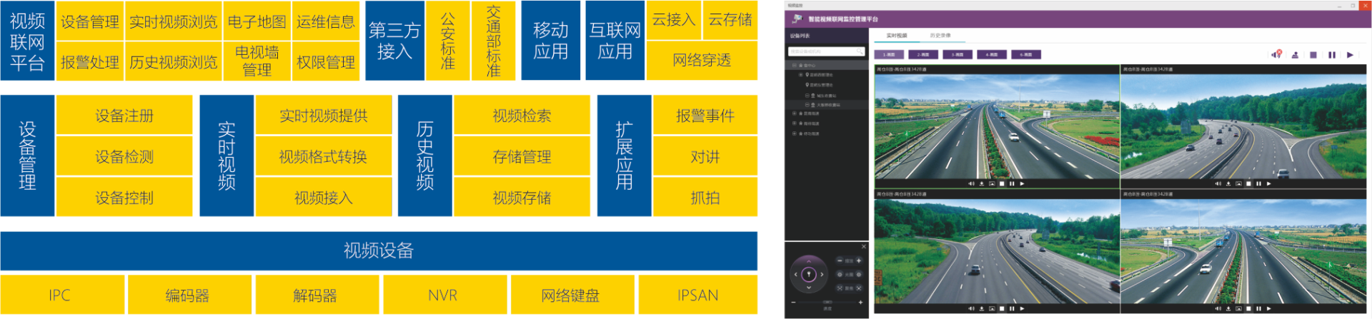 依据GB/T28181GB/T28059国家标准和ONVIF标准,采用面向资源的信息系统架构风格,基于微内核的通用构建体系,利用多任务调度的并行计算和虚拟化技术,实现了具备设备集中管理、流媒体分发、存储、调度、设备的实时监控、报警联动和用户权限管理等功能的高性能、稳定的智能视频联网监控管理平台。同时平台可以与路网监控系统、视频检测系统、交通地理信息系统、应急救援指挥调度系统及其它应用系统有机结合,能够大幅度提高对海量监控点的管理和利用效率,达到提升运营管理水平的最佳效果。